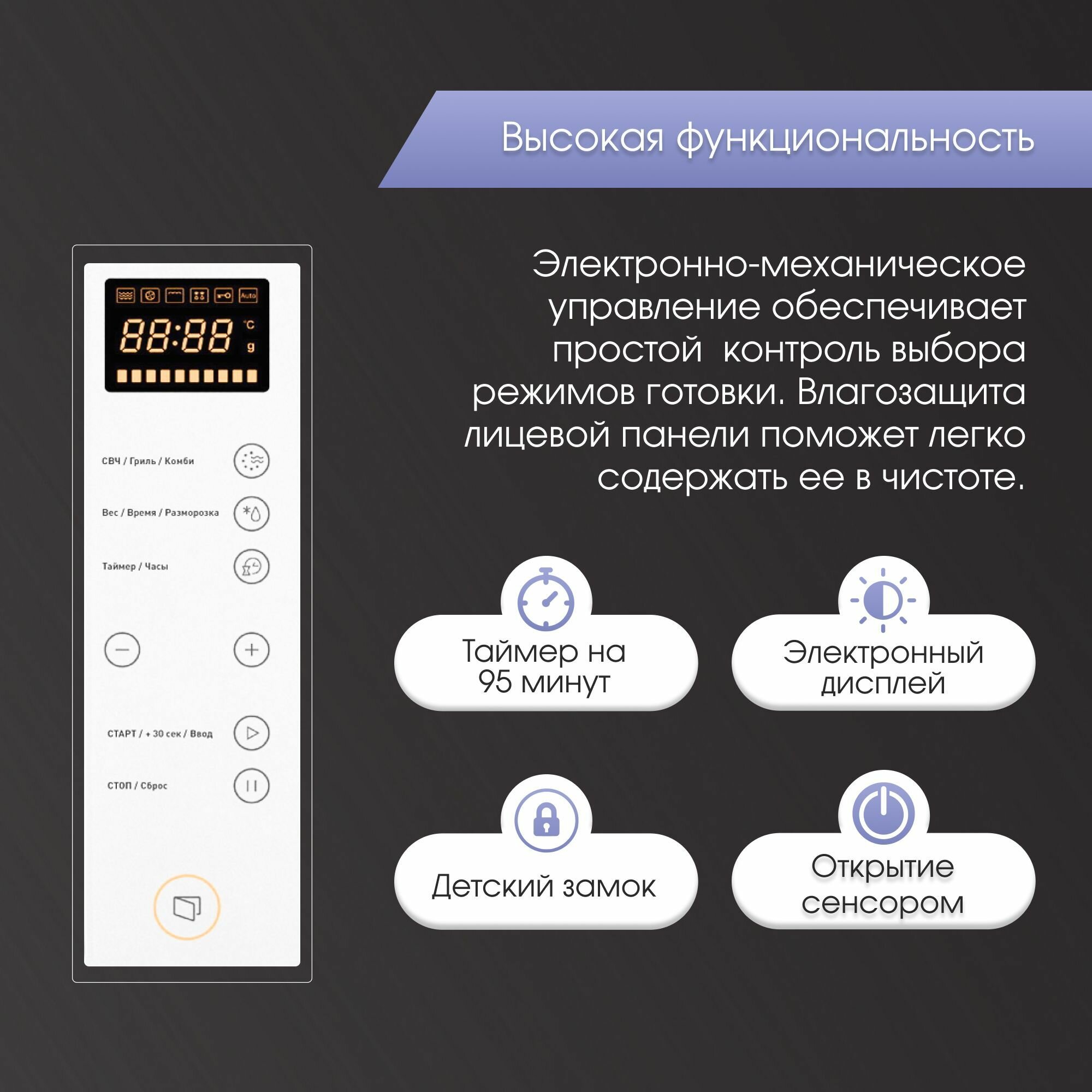 Микроволновая печь FS MWO D 20.10 WH, Сенсорное управление, 6 программ для приготовления, антипригарная эмаль, таймер, блокировка от детей.