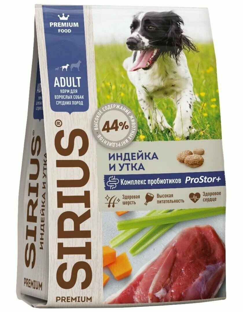 Сухой корм сириус SIRIUS PREMIUM для взрослых собак средних пород, индейка и утка с овощами, 2 кг