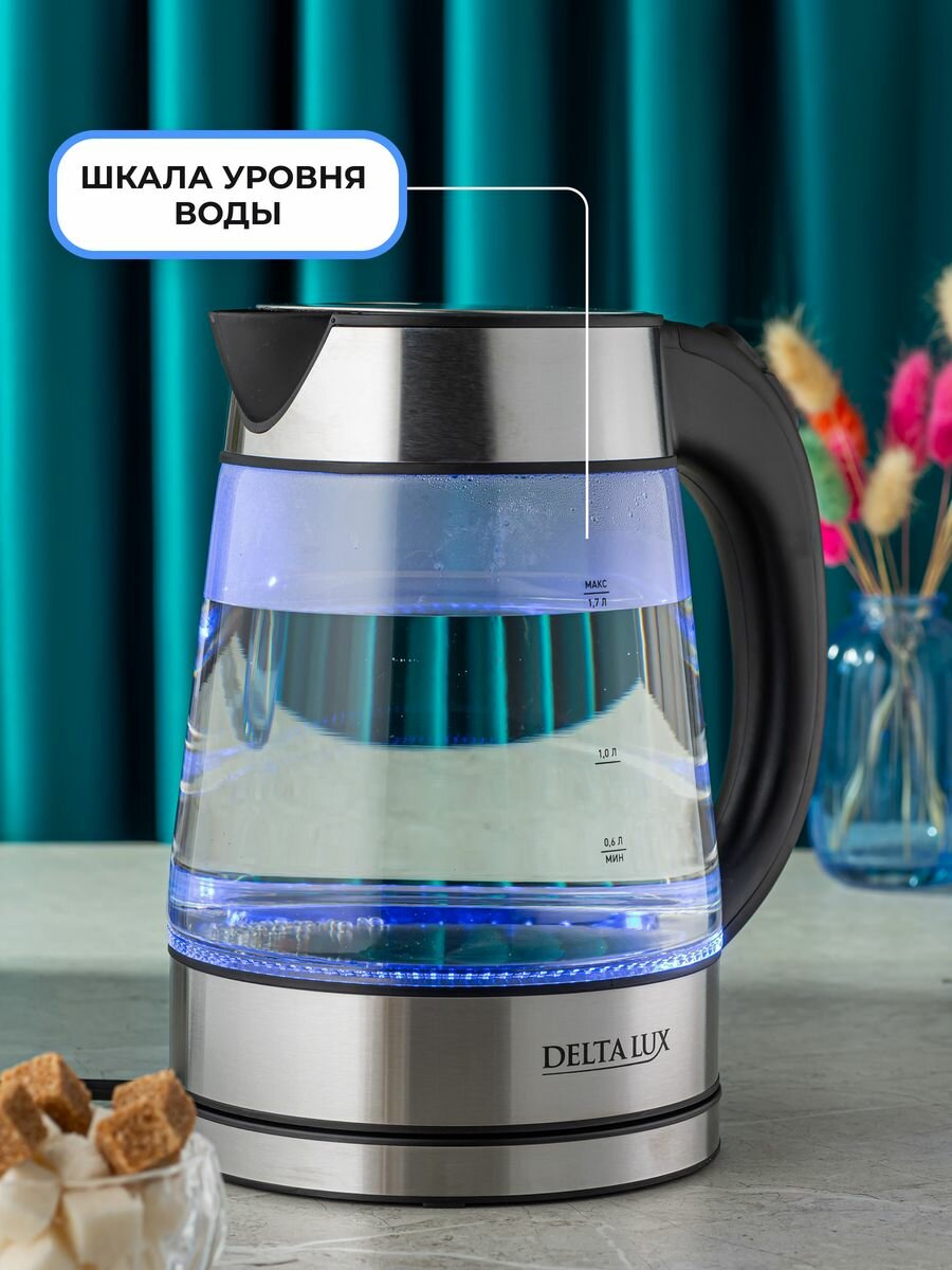 Чайник DELTA LUX DE-1004 корпус из жаропрочного стекла, черный нерж.: 2200Вт, 1,7л