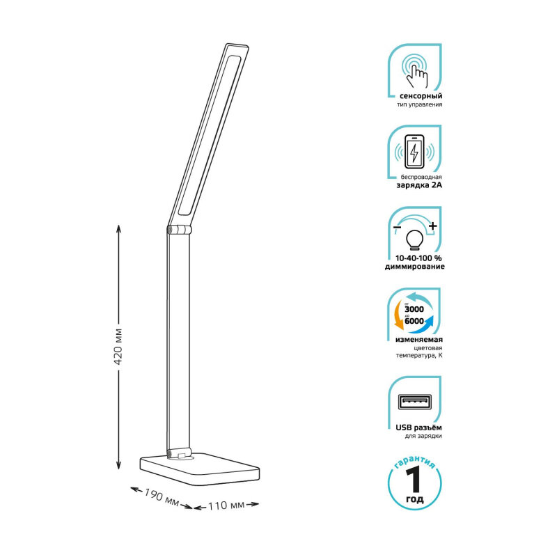 Светильник настольный Qplus GTL501 10W 600lm 3000-6000K 170-265V белый диммируемый Qi USB LED