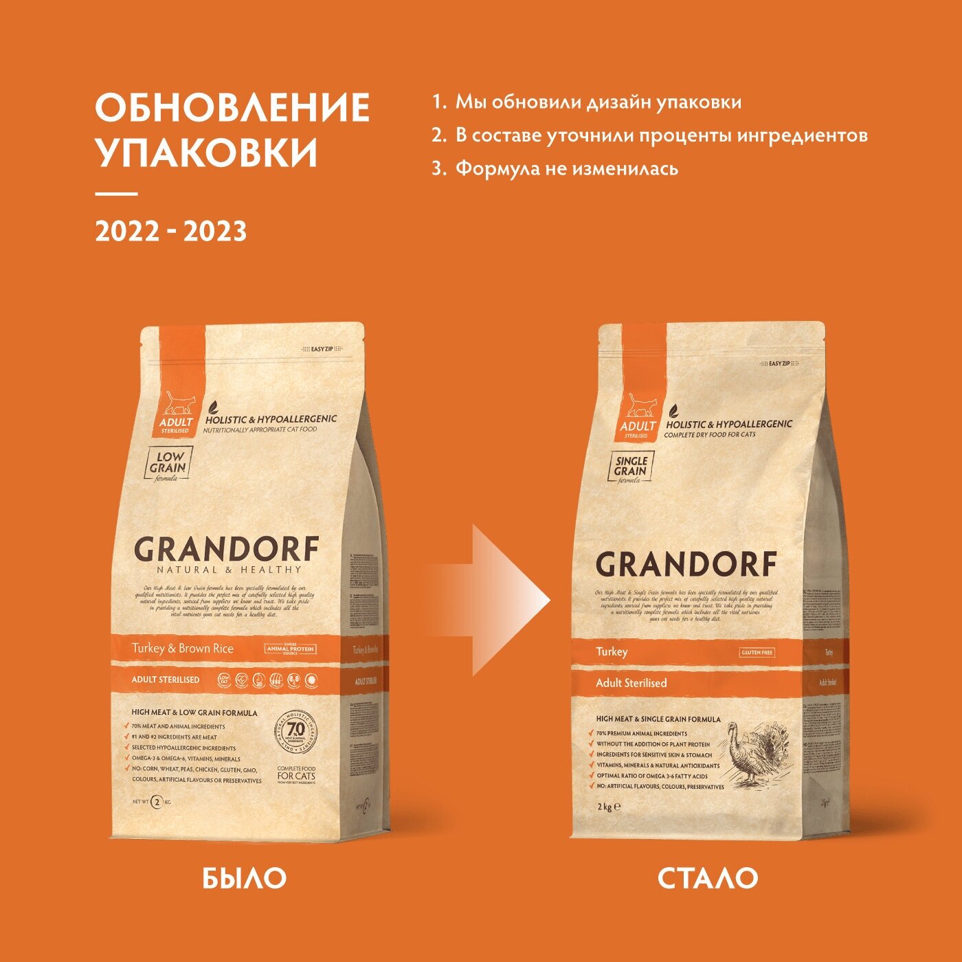Сухой корм Grandorf для стерилизованных кошек, индейка, низкозерновой, 2 кг