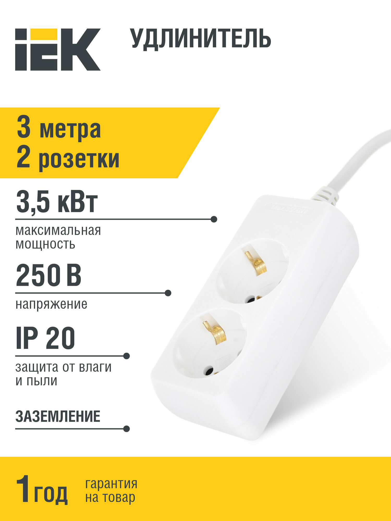 Удлинитель IEK У02, ПВС 3 x 1 мм², с заземлением, 2 розетки, 3 м, белый