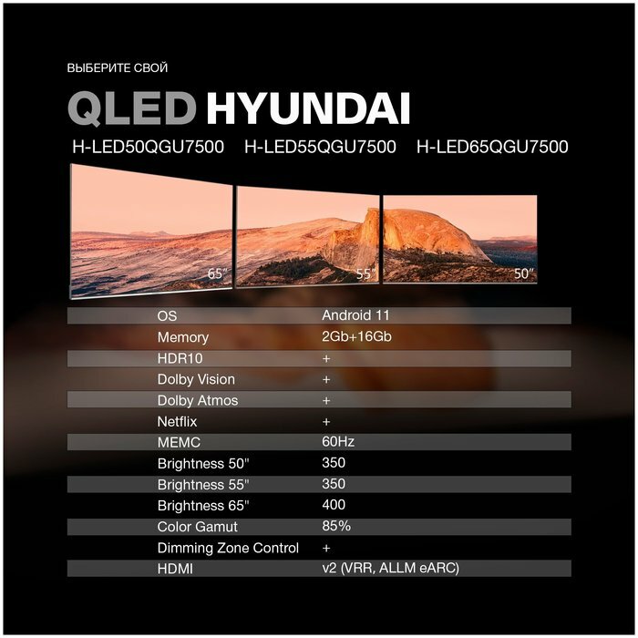 Телевизор Hyundai H-LED55QBU7500, 55", 3840x2160, DVB-T/T2/C/S2, HDMI 3, USB 2, Smart TV
