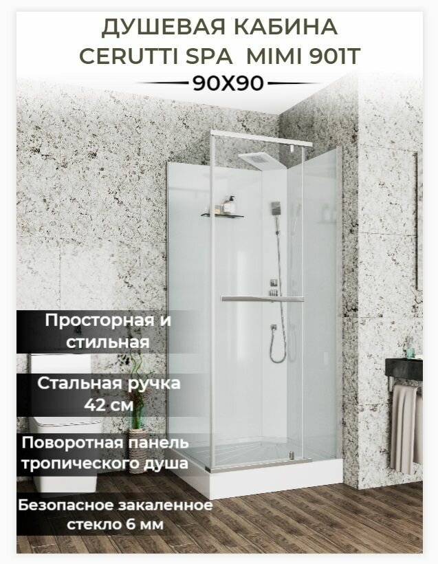 | Дополнительная информация | Душевая кабина Cerutti Spa Mimi 901T 90х90 Без крыши Профиль серебро Стекло прозрачное в современном стиле |