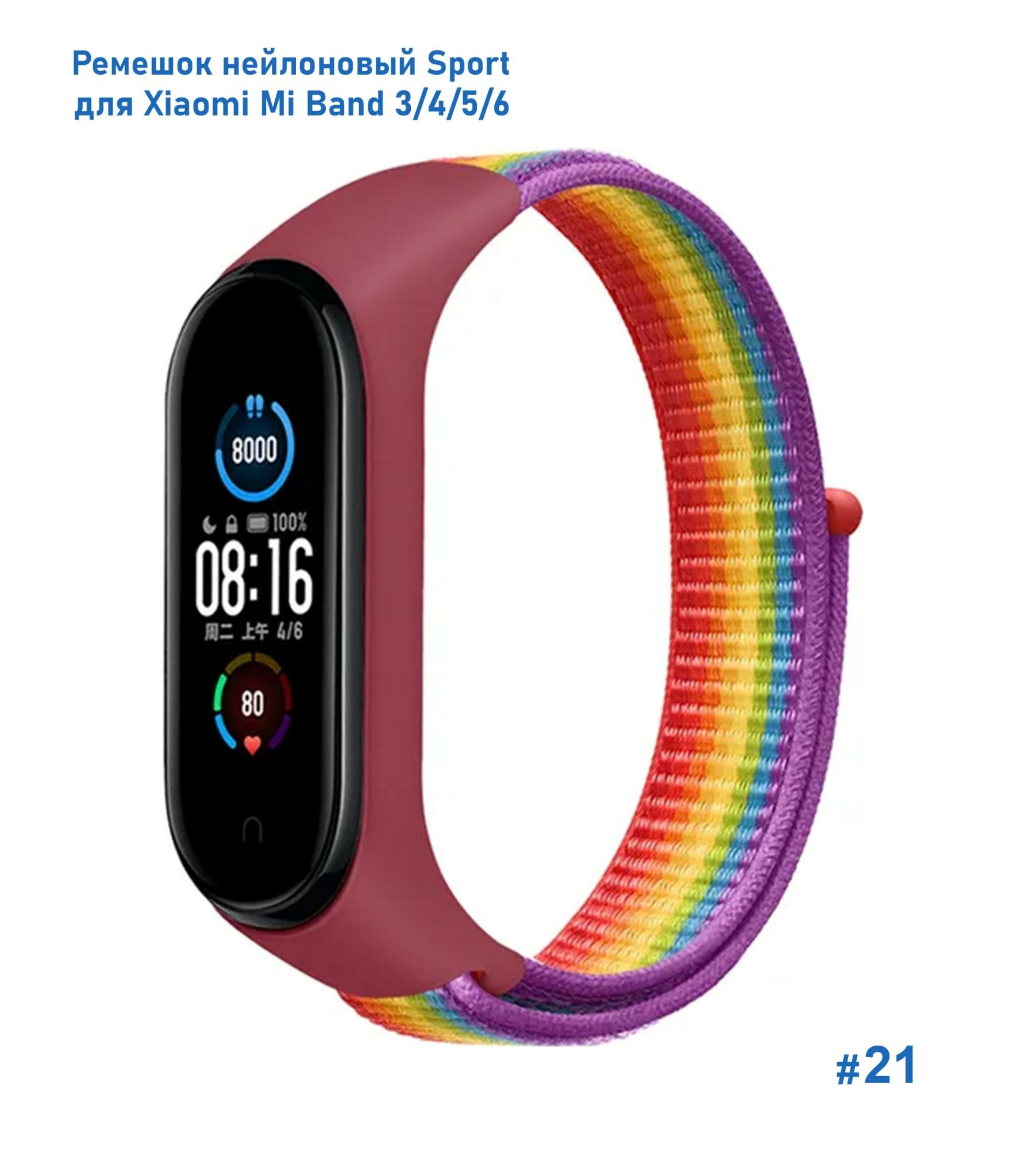 Ремешок нейлоновый Sport для Xiaomi Mi Band 3/4/5/6/7, на липучке, ярко-радужный (21)