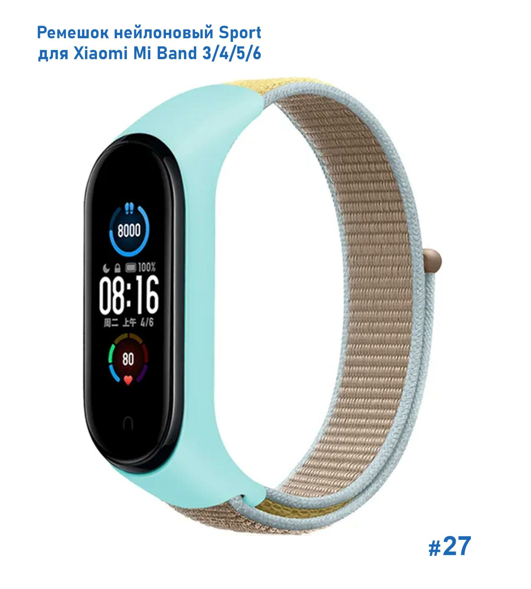 Ремешок нейлоновый Sport для Xiaomi Mi Band 3/4/5/6/7, на липучке, бирюзовый (8)