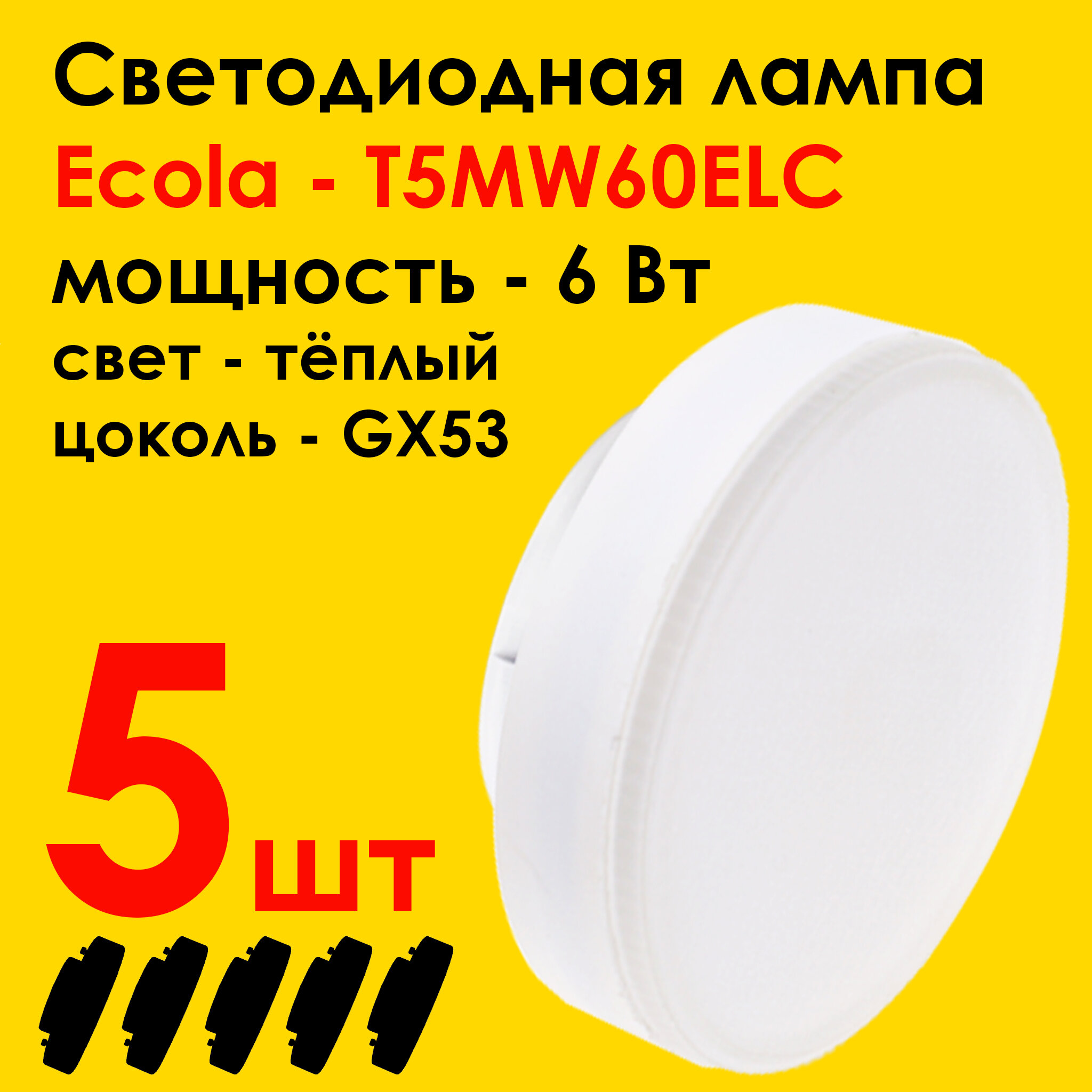 (5 шт.) Светодиодная лампочка Ecola GX53 св/д 6W 6400K 6K 27x75 матов. Light T5MD60ELC