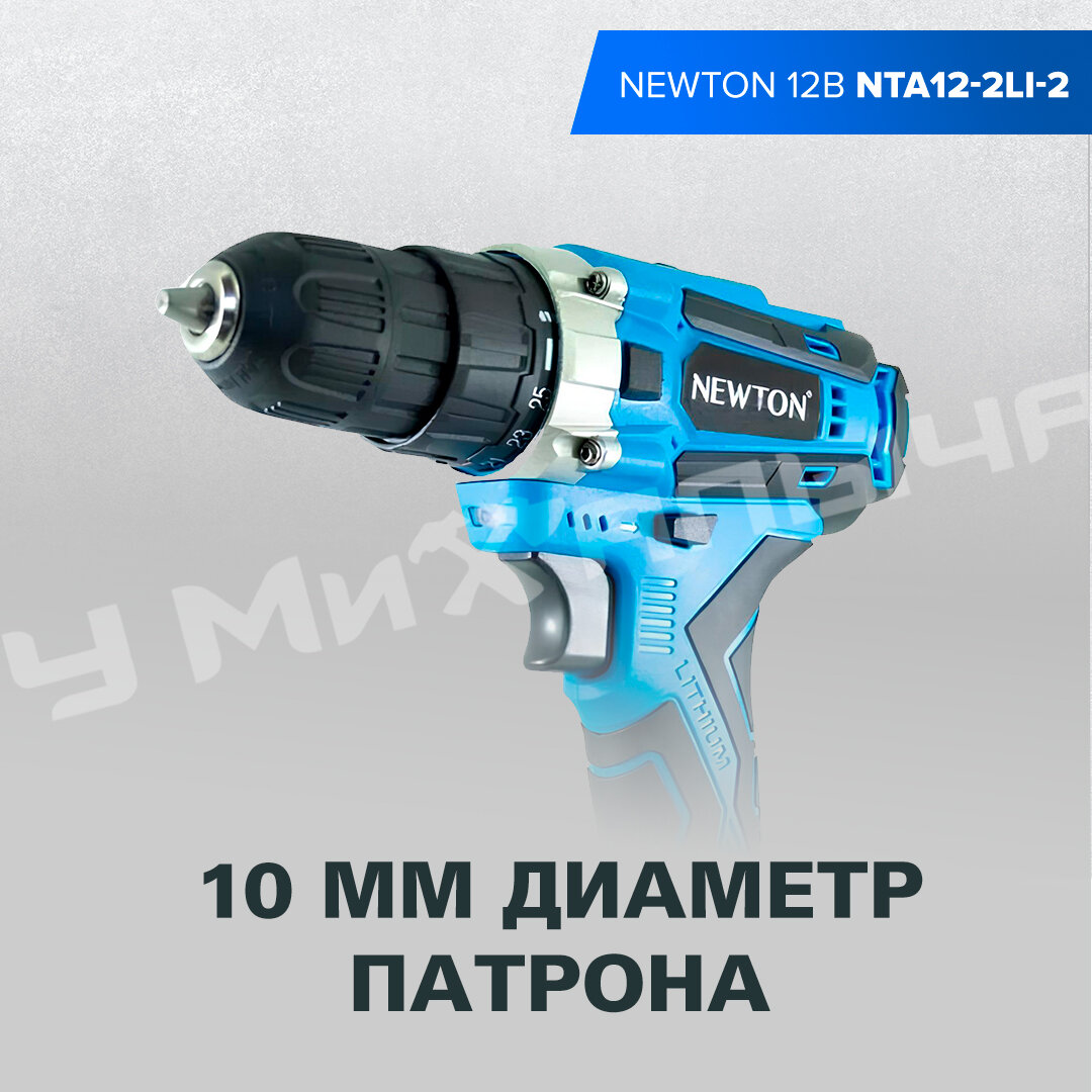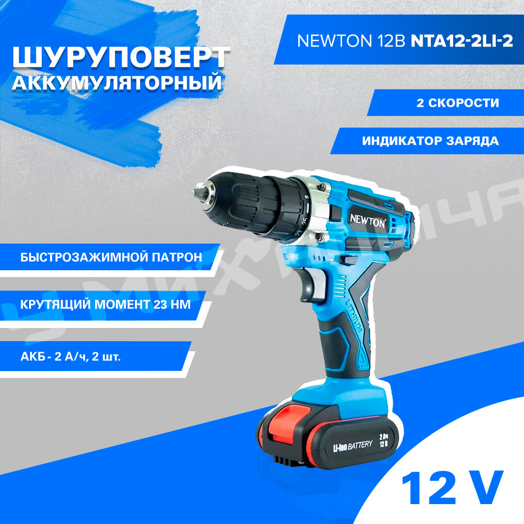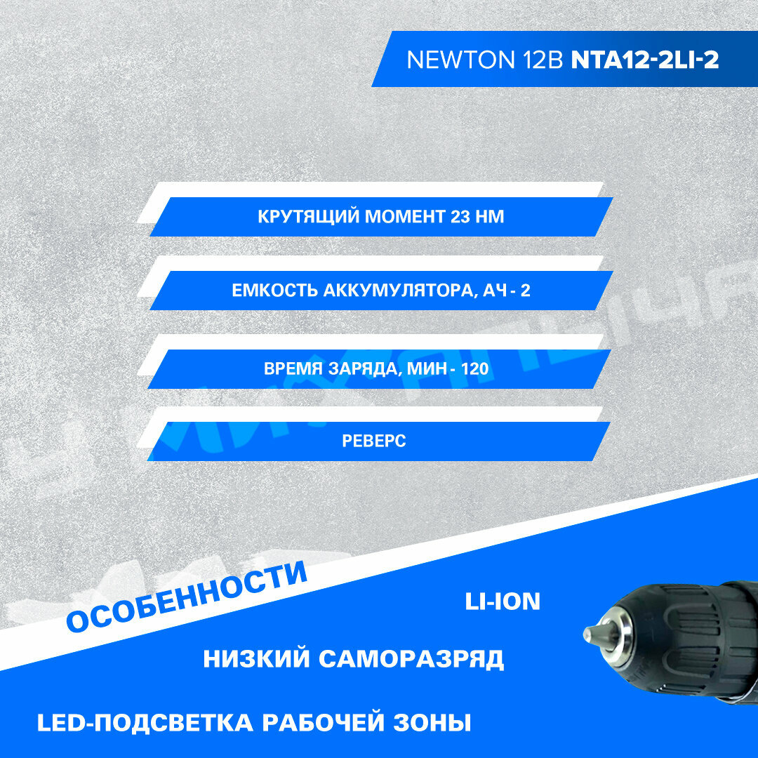 Аккумуляторный шуруповерт Newton 12В NTA12-2Li-2, 1350 об/мин, Li-ion 2 шт 2Ач, 23Нм, подсветка, реверс, кейс интересное: