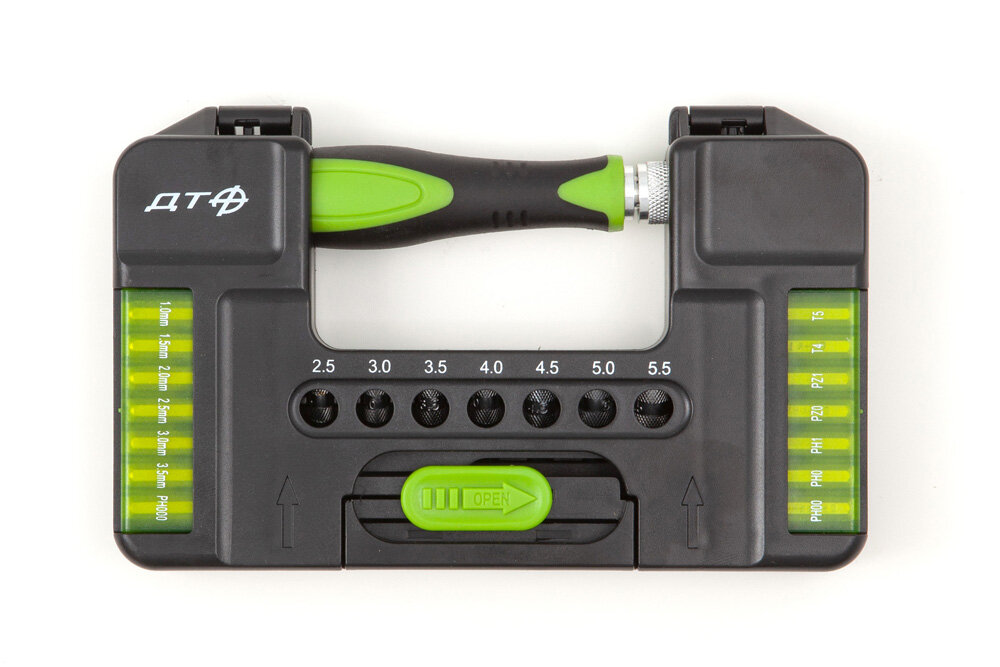 Отвертка ручная Дело техники, цанговая, для точных работ, с битами 1/8'', 786137, зеленый, серебристый, черный, 37 предметов