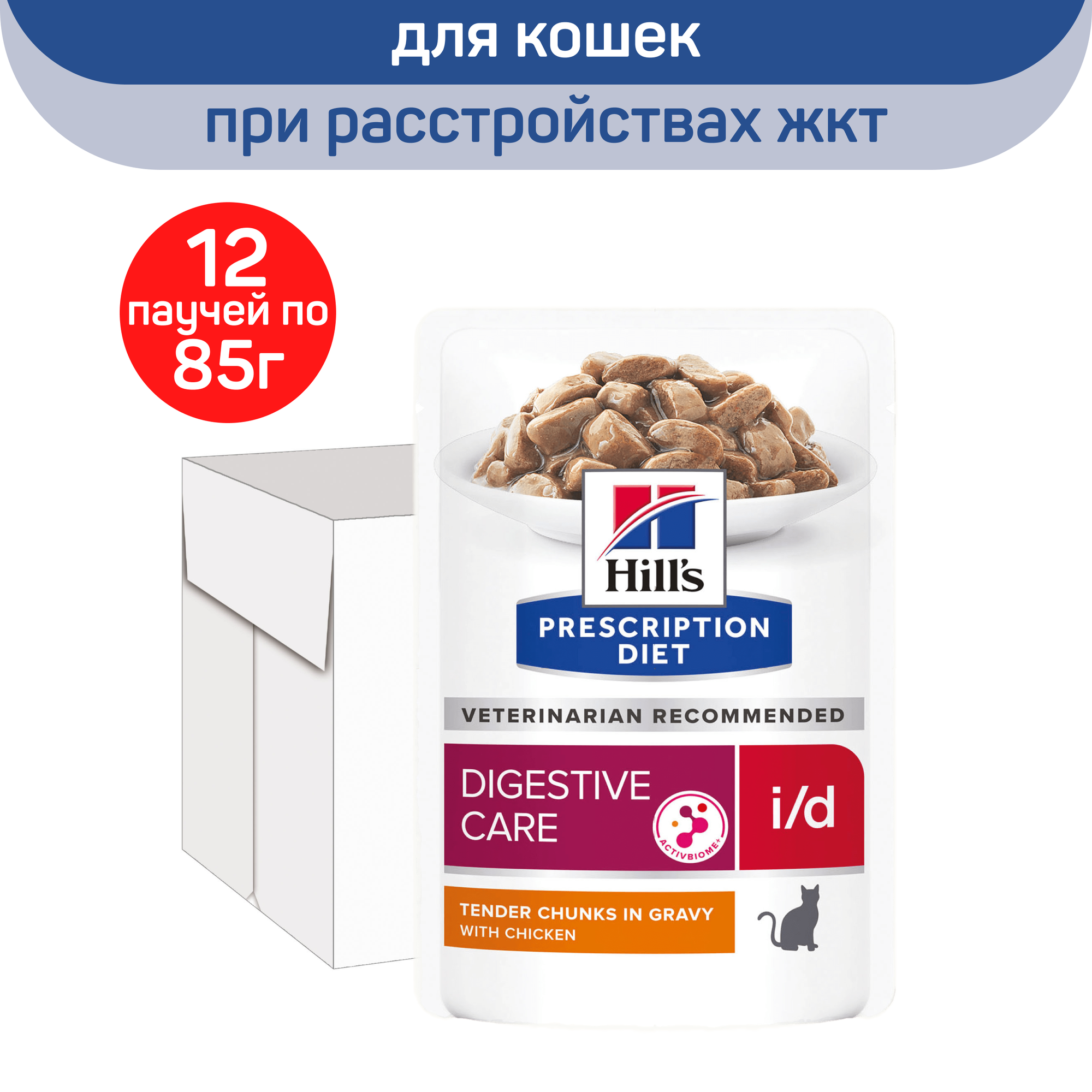 Влажный диетический корм для кошек Hill's Prescription Diet i/d Digestive Care при расстройствах пищеварения, жкт, с курицей, 12 шт. х 85 г (кусочки в соусе)