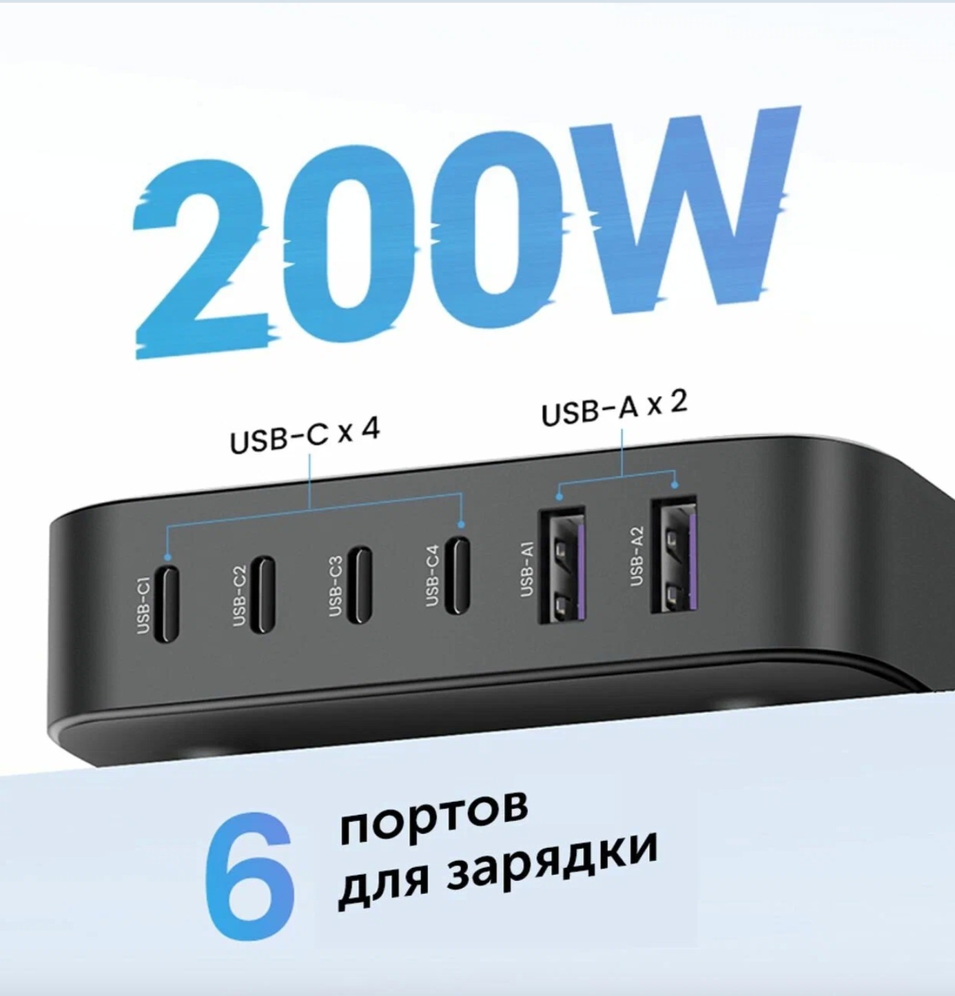 Хаб сетевой UGREEN CD271 2 шт USB-A + 4шт USB-C мощностью 200W Desktop Charger (6-Port) - Black