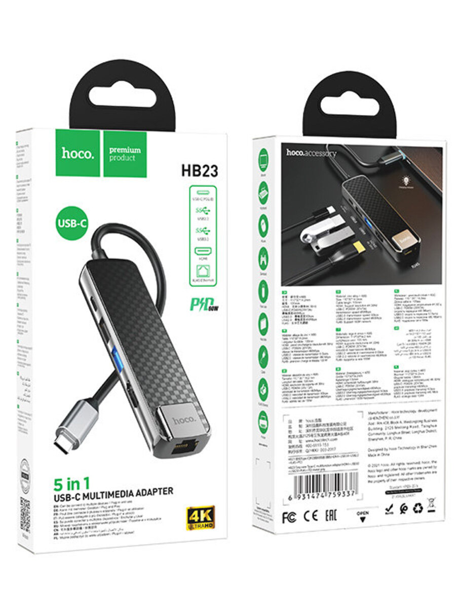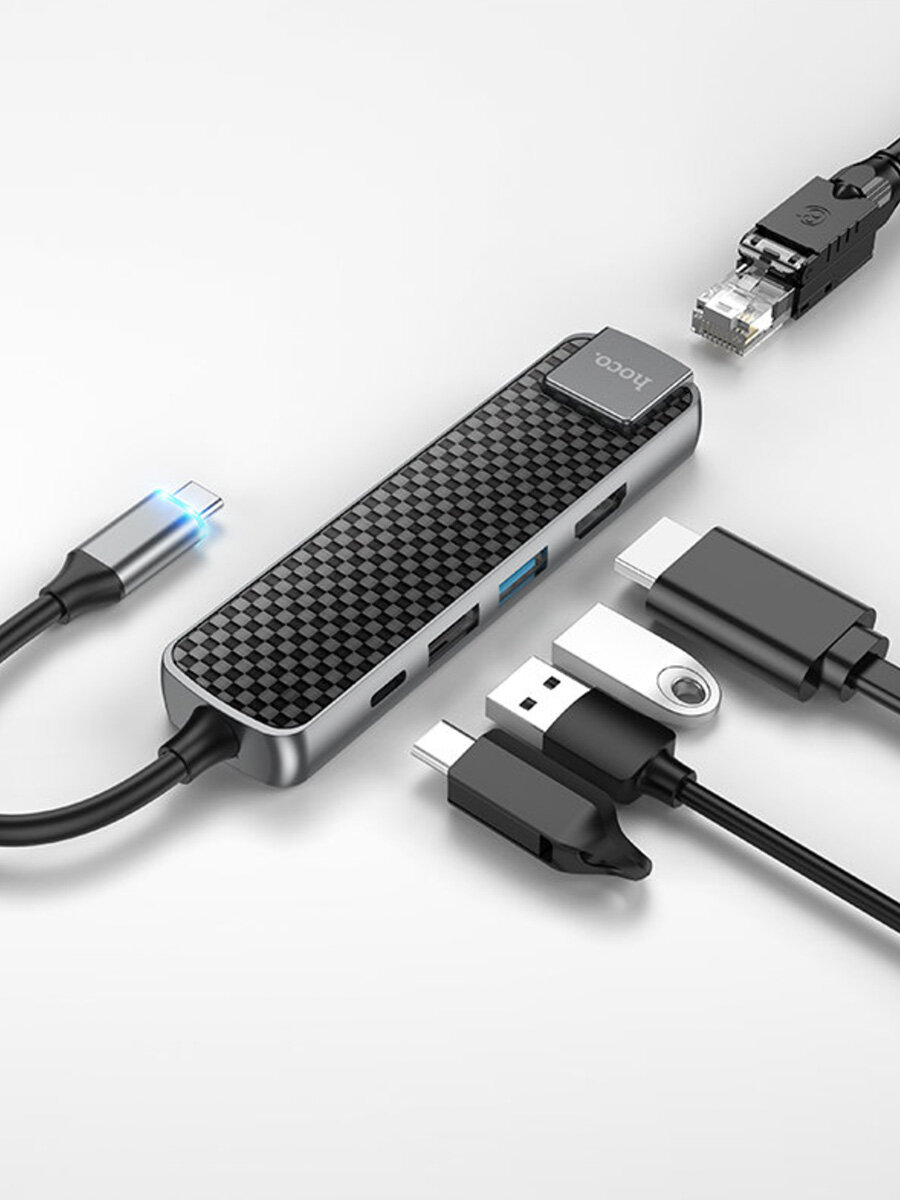 СохранитьAdapter / Переходник HOCO HB23 Easy view Type-C адаптер (HDMI+USB3.0+USB2.0+RJ45+PD), серый интересное: