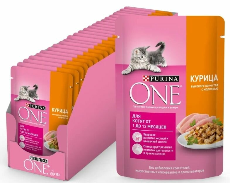 Purina ONE паучи для котят с курицей и морковью - 75 г х 26 шт