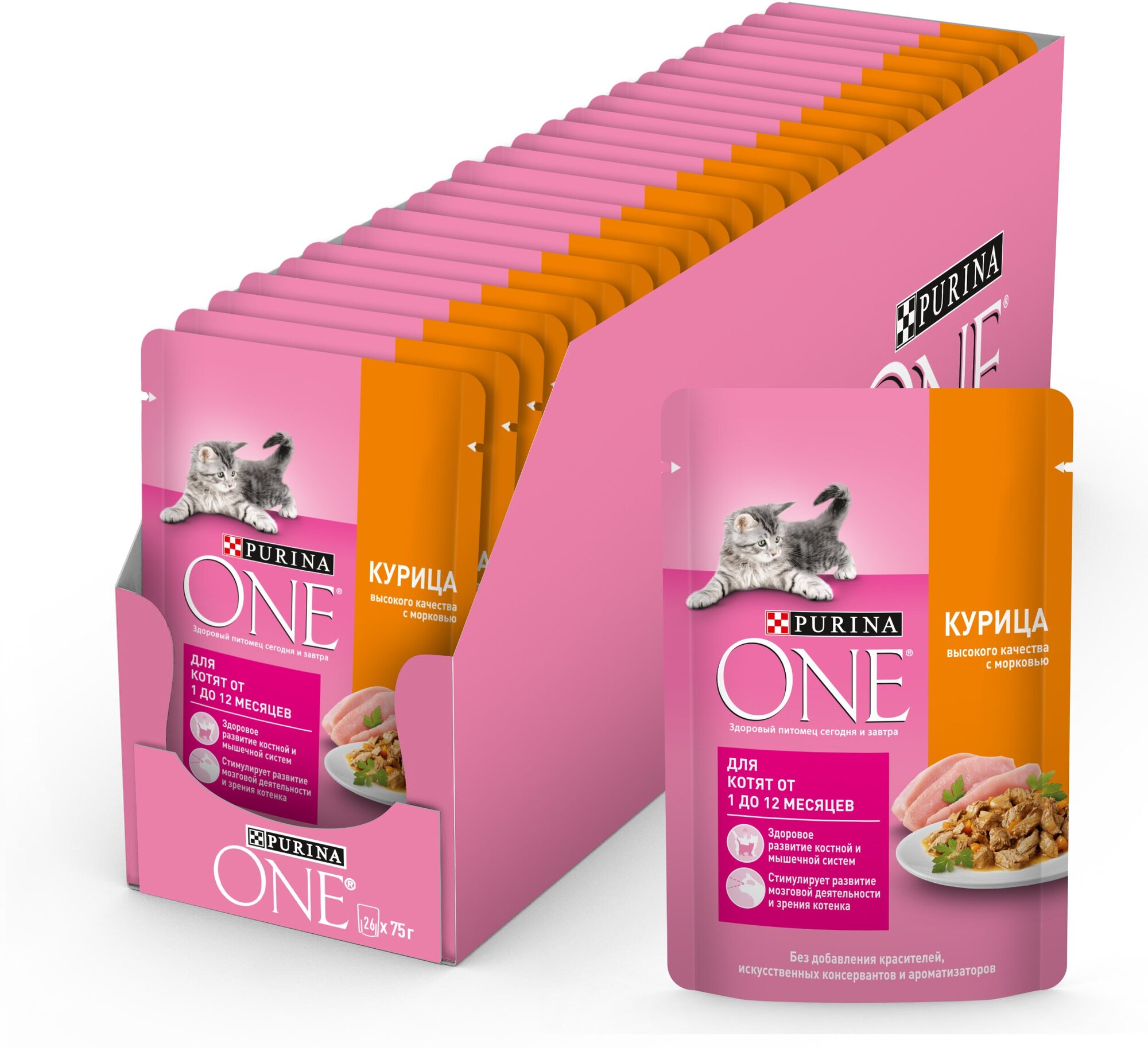 Влажный корм Purina One для котят, курица с морковью, пауч, 75 г*26 шт