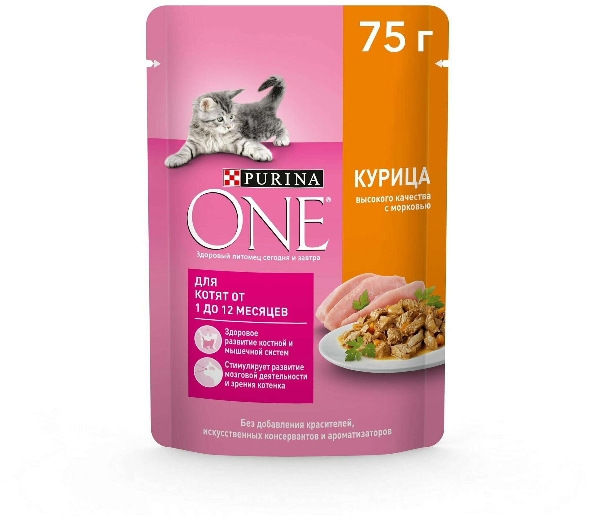 Purina ONE Kitten полнорационный влажный корм для котят, с курицей и морковью, в соусе, в паучах - 75 г х 26 шт