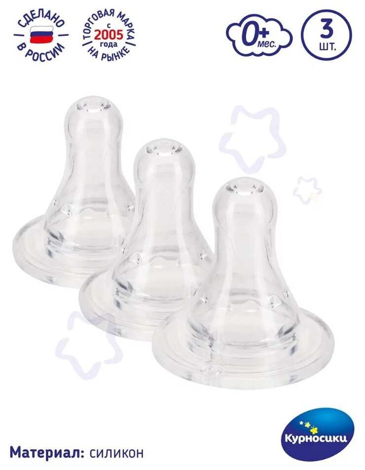 Соска для бутылочки силиконовая Курносики классическая, медленный поток, от 0 мес., 3 шт.