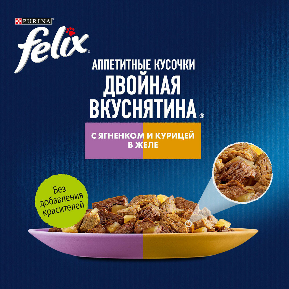 Влажный корм для кошек Felix аппетитные кусочки. двойная вкуснятина, с ягненком и курицей в желе 85 г (кусочки в желе)