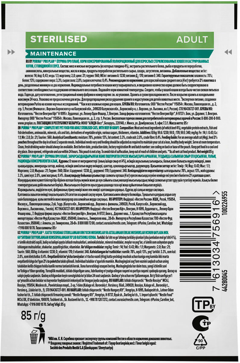 Корм для кошек PRO PLAN Sterilised для стерилизованных, с говядиной в соусе пауч 85г (упаковка - 26 шт)