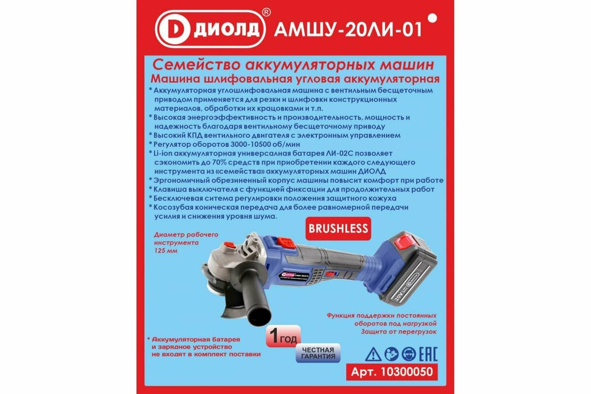 Аккумуляторная угловая шлифмашина Диолд АМШУ-20ЛИ-01 (без батареи и ЗУ) 10300050