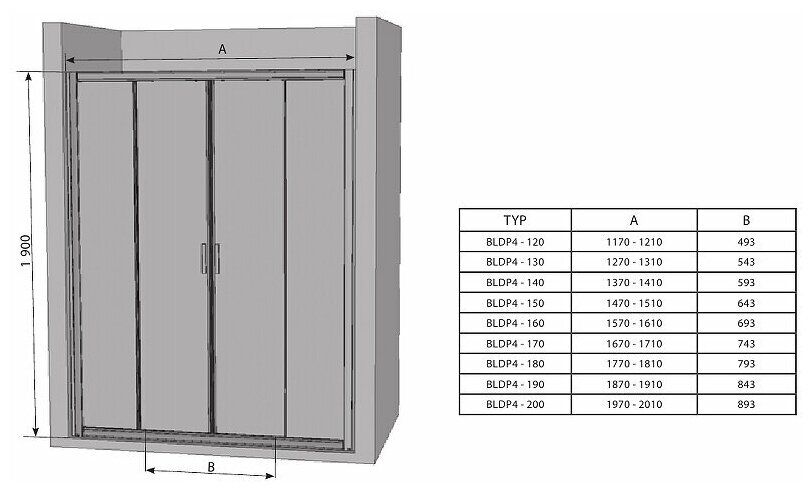 Душевая дверь RAVAK BLIX BLDP4-190 (1870-1890x1900) раздвижная, стекло, блестящий+Transparent