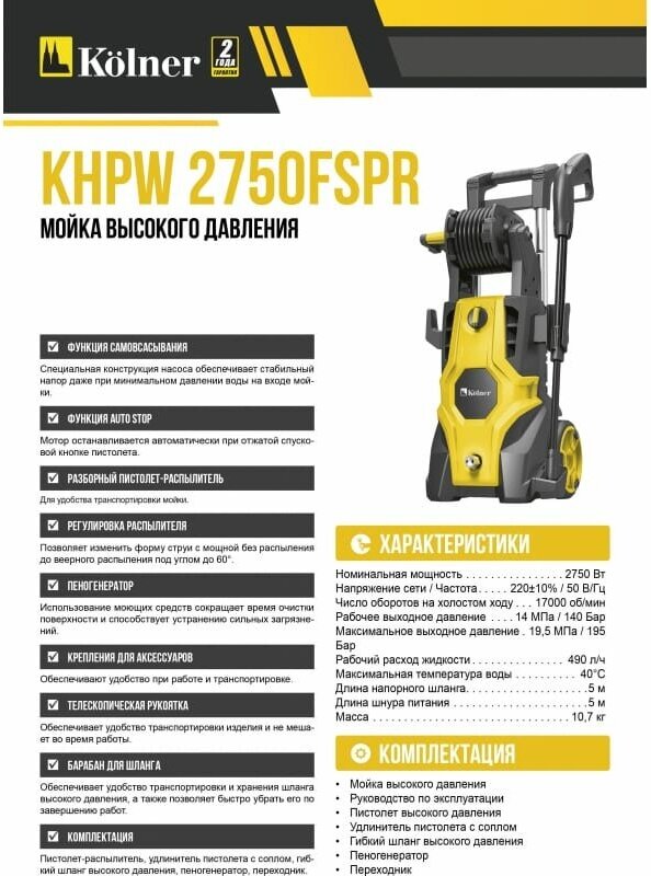 Kolner Мойка высокого давления Kolner KHPW2750FSPR 2750 Вт, 140/195 бар, 490 л/ч кн2750фспр