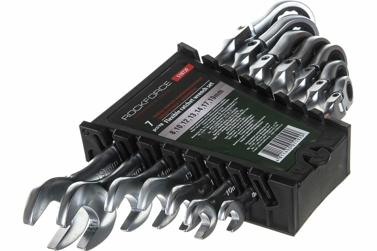 Набор ключей трещоточных комбинированных ROCKFORCE RF-51072F, с шарниром, 7 предметов, 8, 10, 12, 13, 14, 17, 19 мм, пластиковый держатель