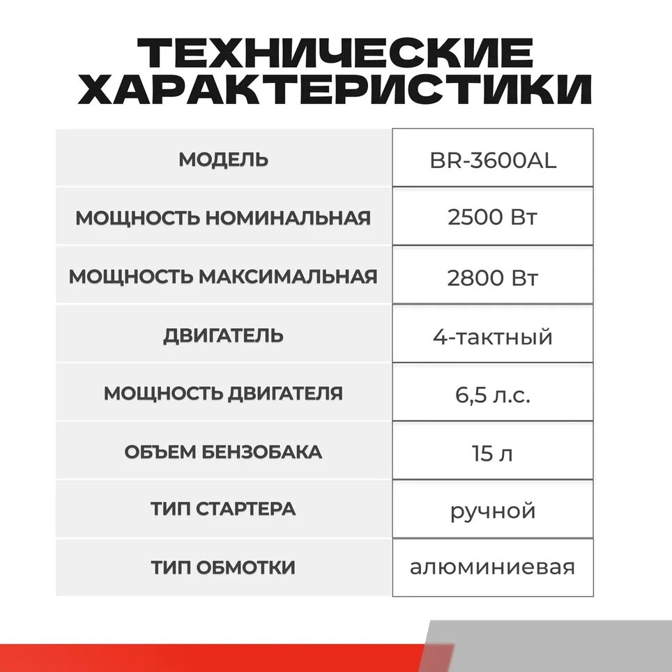 Генератор бензиновый BR3600-AL (2,5/2,8кВт,220В,50Гц,12В) интересное: