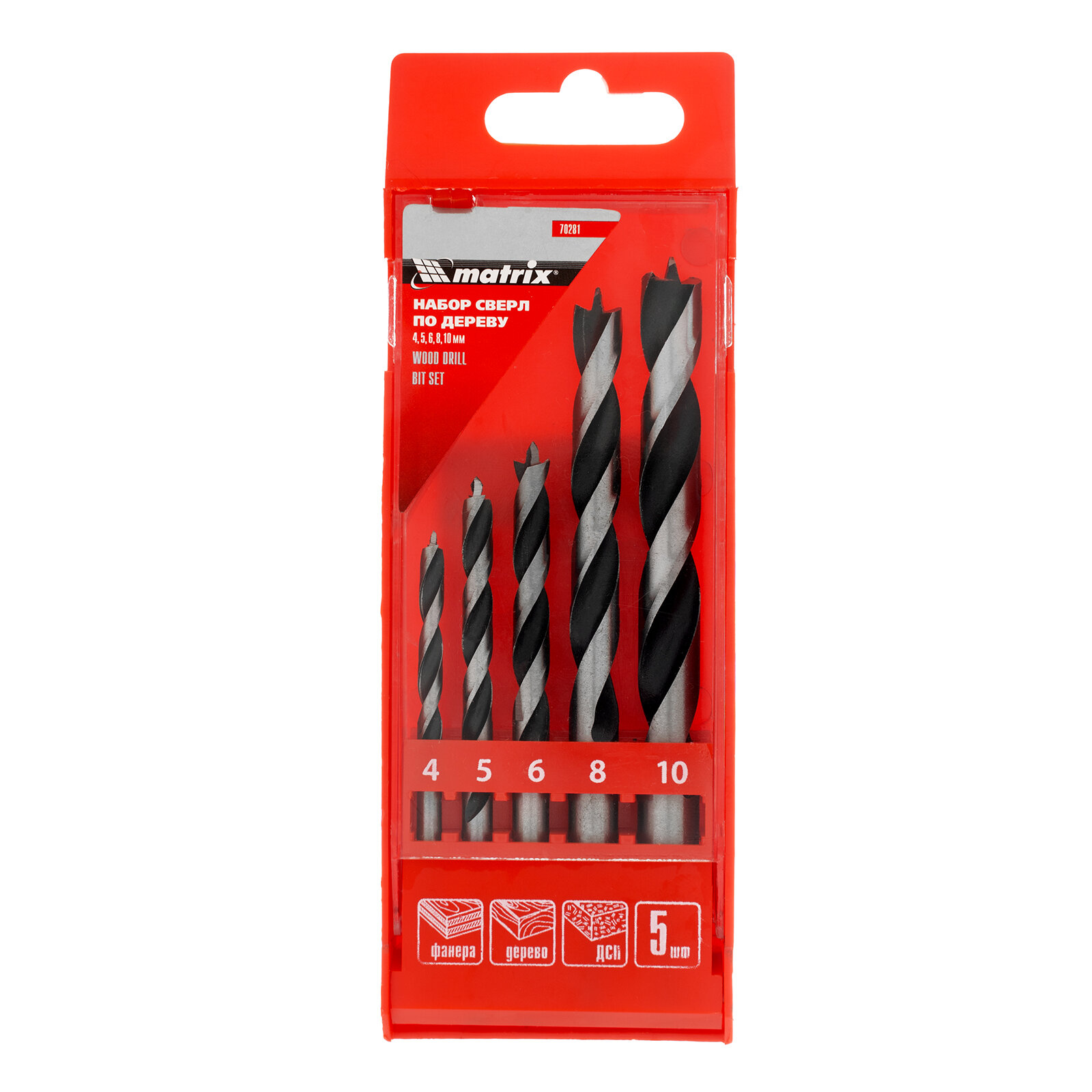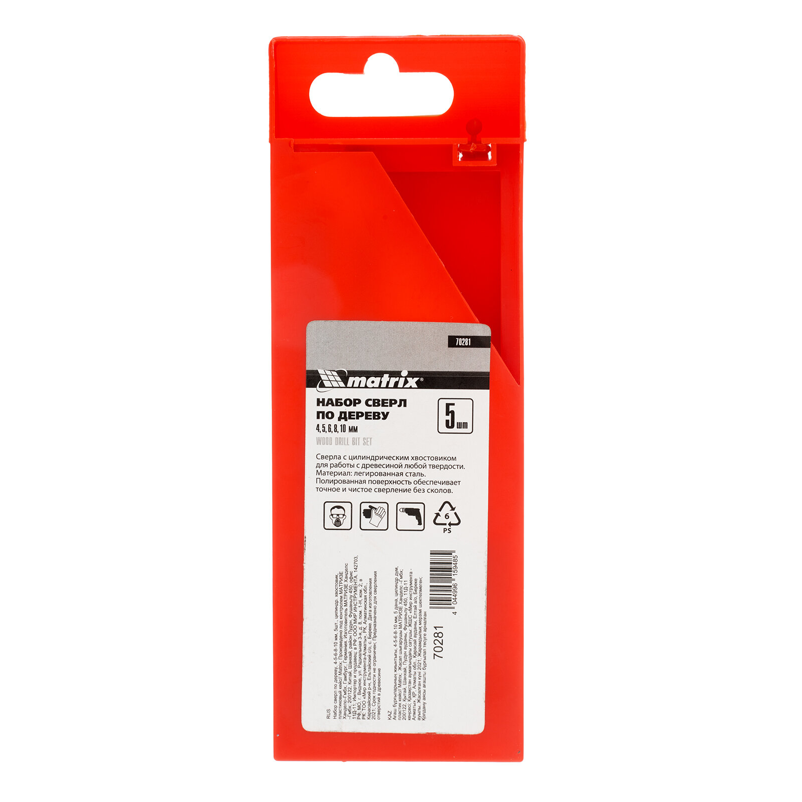 Набор сверл по дереву, 4-5-6-8-10 мм, 5 шт, цилиндрический хвостовиковик, пластиковый кейс, Matrix (арт. 70281)