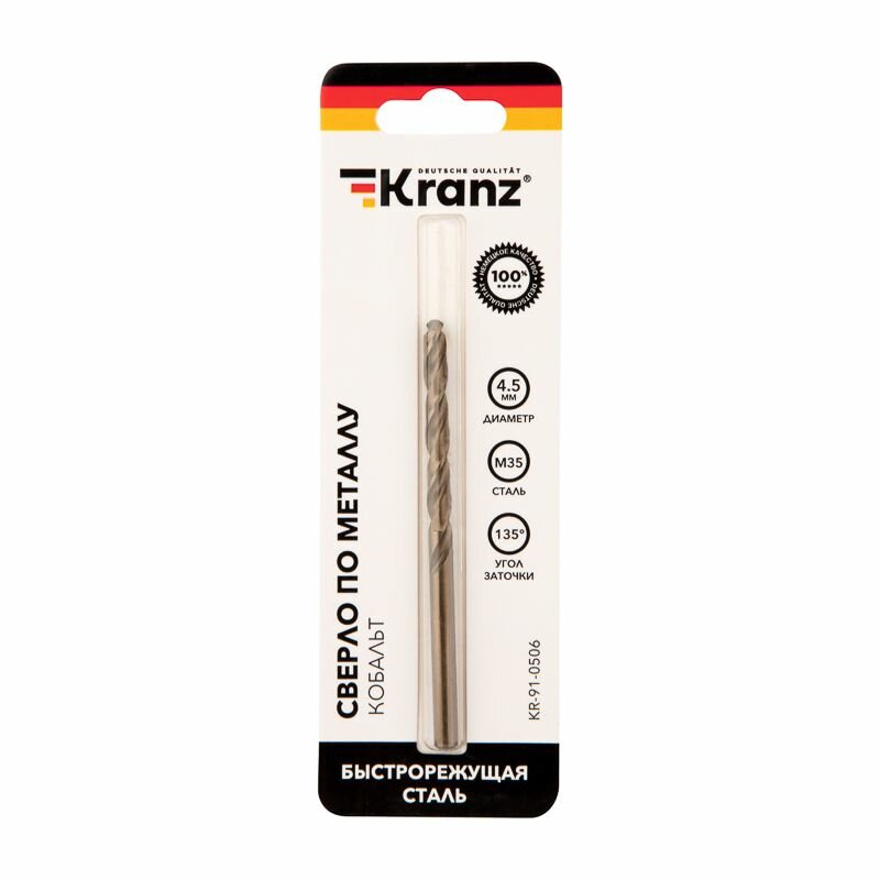Купить Сверло по металлу 4.5мм «Кобальт» (сталь HSS-Co 5% M35 P6M5K5) DIN 338 (блист.1шт) Kranz KR-91-0506
