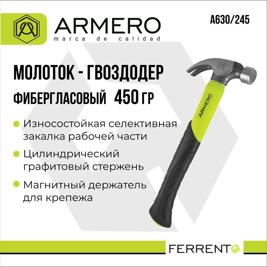 Молоток - гвоздодер фиберглассовый ARMERO 450г, Armero, A630/245,