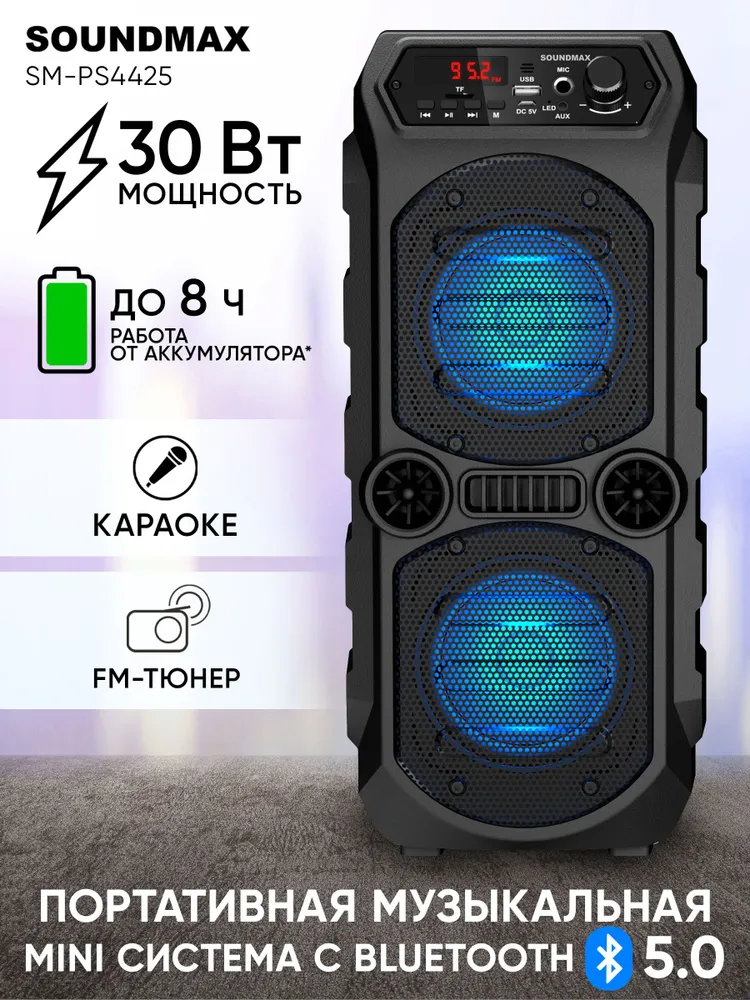 Ниже Вы можете прочитать отзывы на SOUNDMAX Портативная караоке система Soundmax SM-PS4425, 30 Вт, 1200 мАч, BT,SD, AUX, USB,подсветка, ознакомится с подробными характеристиками, посмотреть интересные обзоры и фотографии на SOUNDMAX Портативная караоке система Soundmax SM-PS4425, 30 Вт, 1200 мАч, BT,SD, AUX, USB,подсветка.
