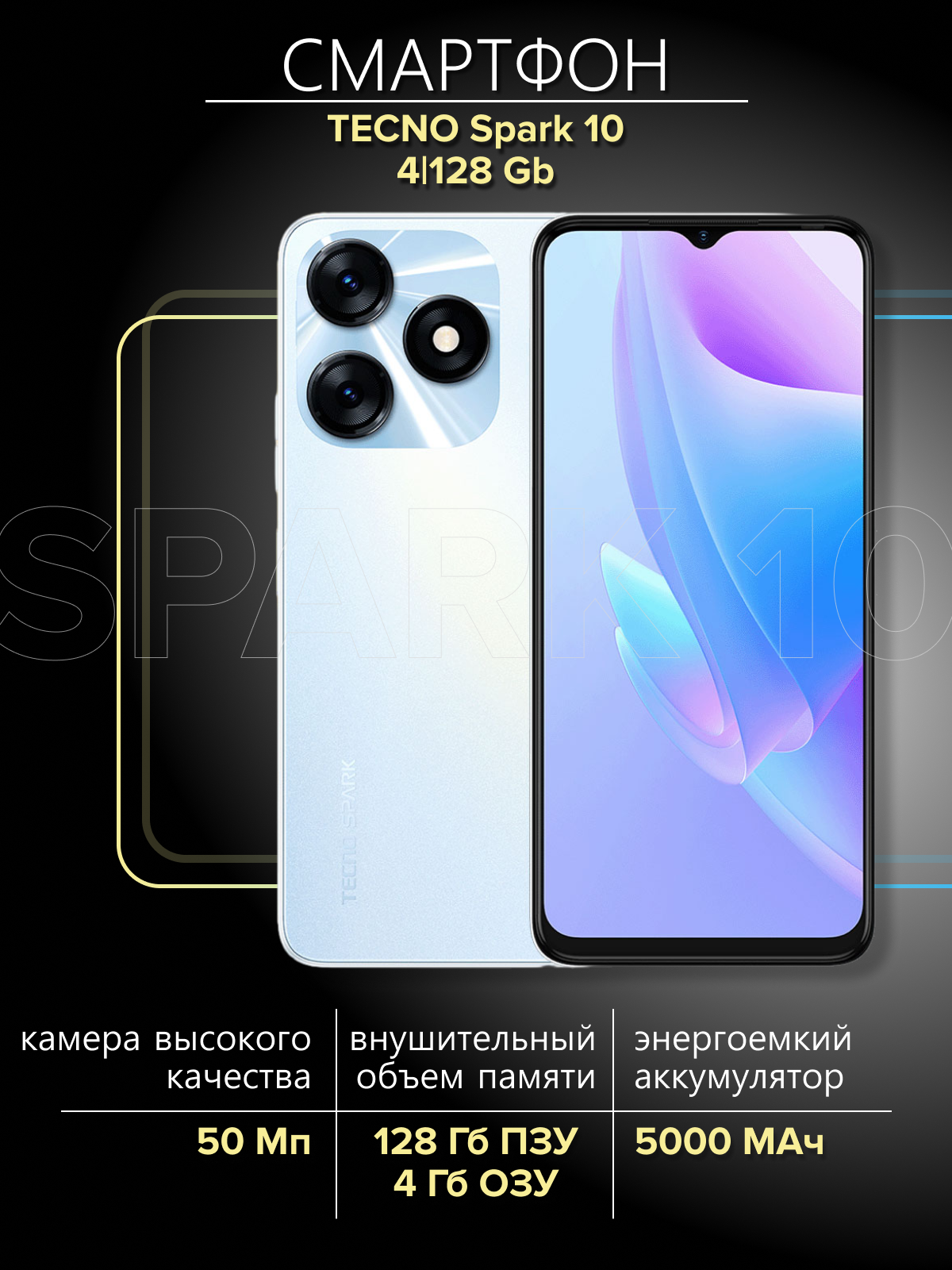 Смартфон TECNO Spark 10 4/128 ГБ (Android 13, 50Мп, NFC), 2 nano SIM, белый