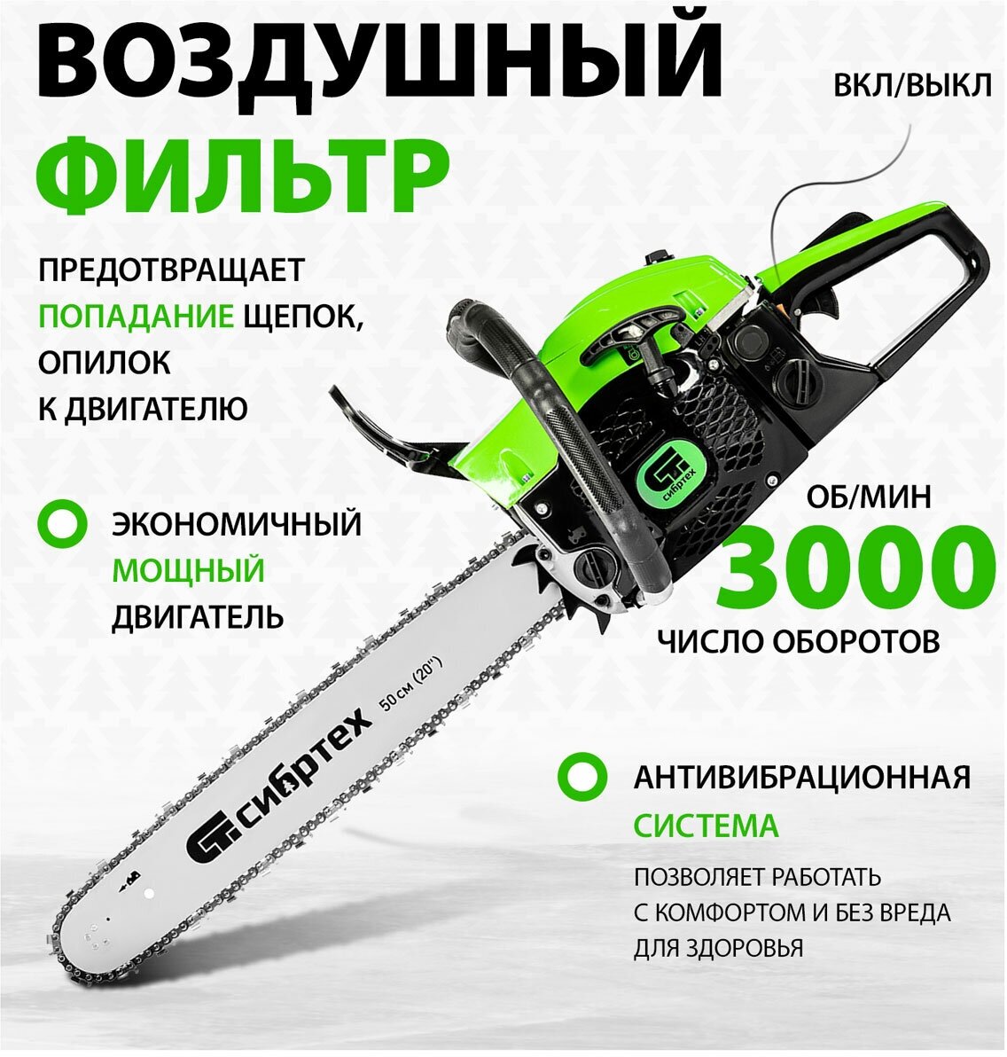 Пила цепная бензиновая, Сибртех, 4 л.с., длина шины 50 см, шаг цепи 0.325 дюйм, 76 звен, ПЦБ-5850, паз 1.5 мм