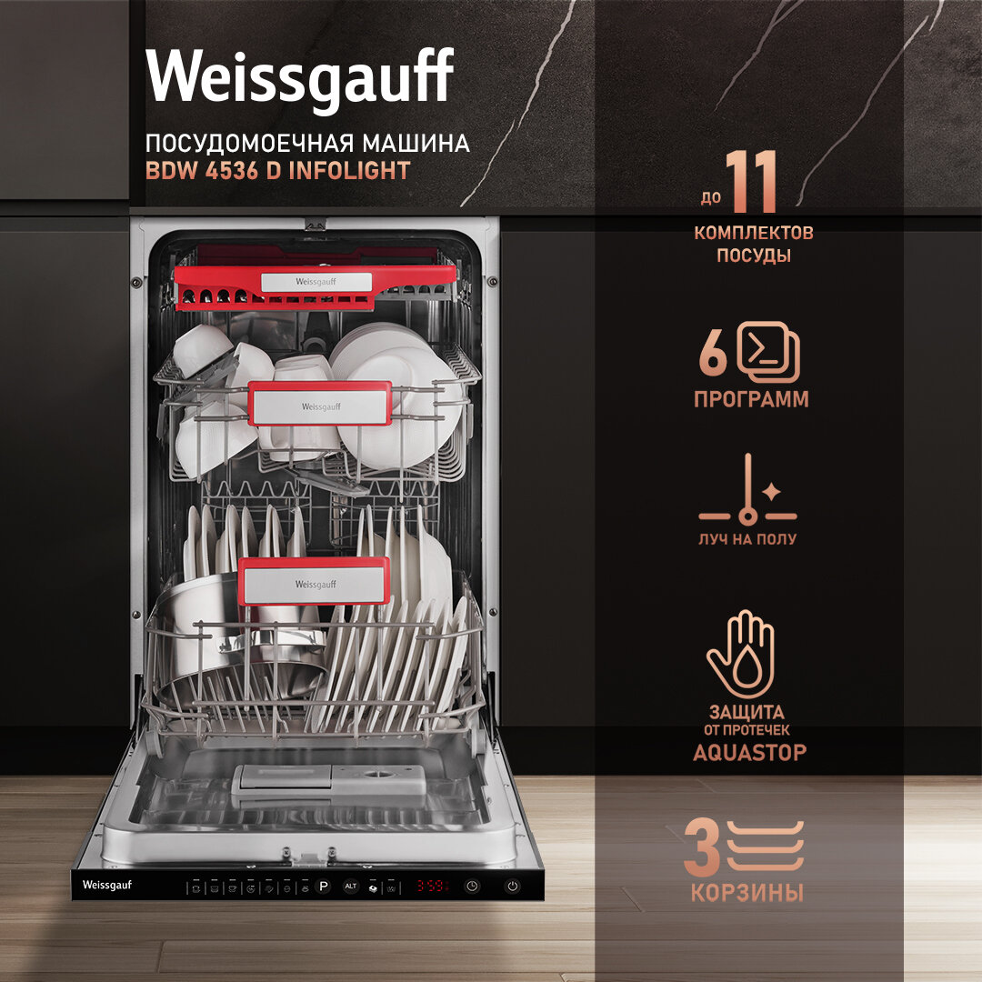 Встраиваемая посудомоечная машина с лучом на полу Weissgauff BDW 4536 D Infolight,3 года гарантия, 3 корзины, 11 комплектов, 6 программ, дополнительная сушка, предварительная мойка, таймер, полная защита от протечек, автопрограмма Blitz Wash