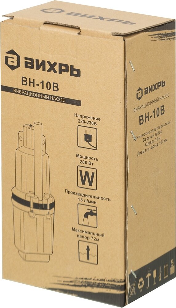 Купить Вибрационный насос вихрь ВН-10В, 280 Вт, диаметр насоса 100 мм, глубина погружения 3 м, 18 л/мин, 68/8/1