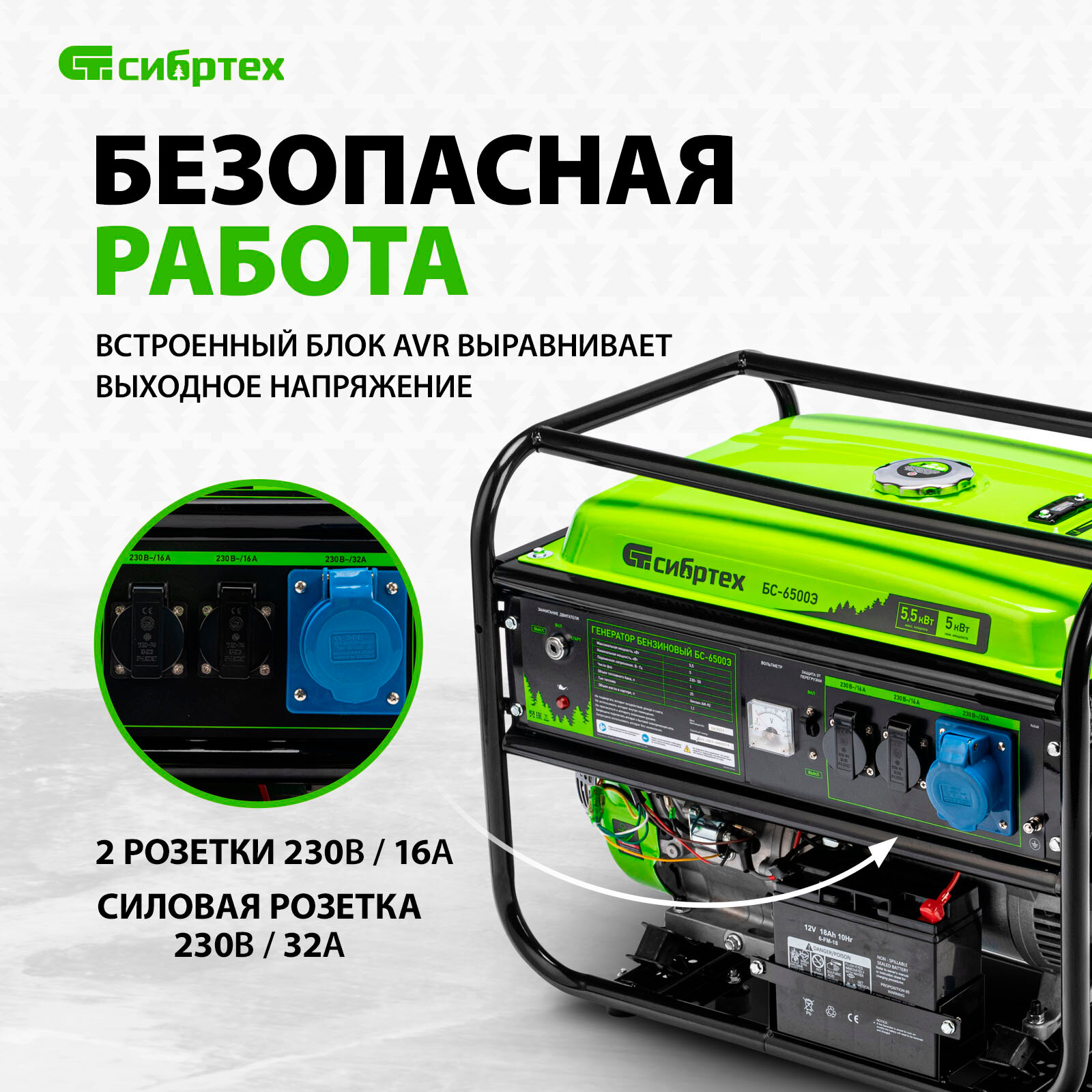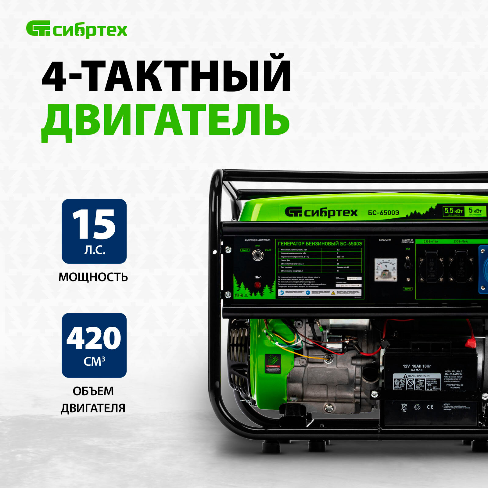 Бензиновый генератор Сибртех БС-6500Э, 5,5 кВт, 230В, 4-х такт., 25 л, электростартер
