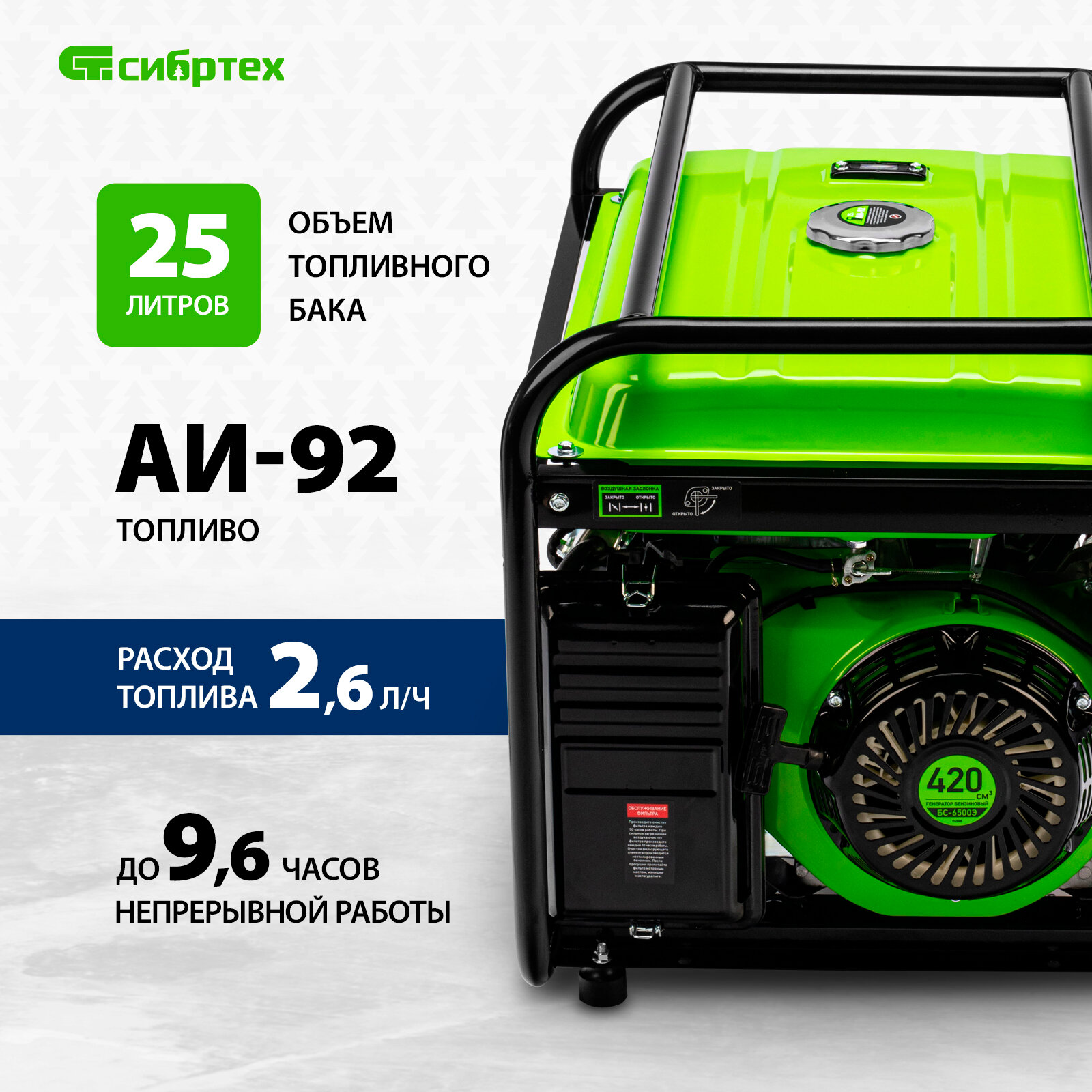 Генератор бензиновый СИБРТЕХ (25 л.с, 5,5 кВт, электростартер, БС-6500Э)