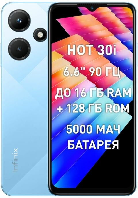 Смартфон INFINIX HOT 30i 8Гб 128Гб Glacier Blue 6.56"", IPS, 1612*720, 8*1.6ГГц, 13+0.3Мп, 8Мп, 4G, NFC, 5000мАч, And 12