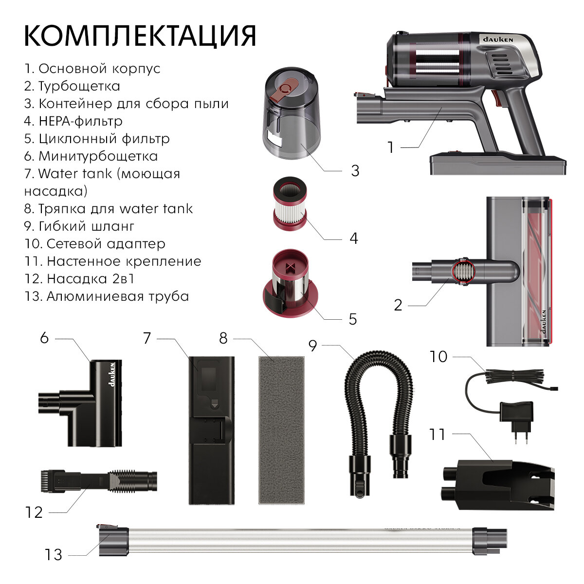 зарядное устройство, настенный держатель, турбощетка, универсальная насадка для влажной уборки, фильтр тонкой очистки, щелевая насадка, Water tank (моющая насадка), Аккумулятор, Вертикальный пылесос, Гарантийный талон, Гибкий шланг, Зарядная станция, Инструкция, Контейнер, Минитурбощетка, Моторный блок, Насадка для мебели/щелевая 2в1, Настенное крепление, Турбощетка с подсветкой, Фильтр грубой очистки