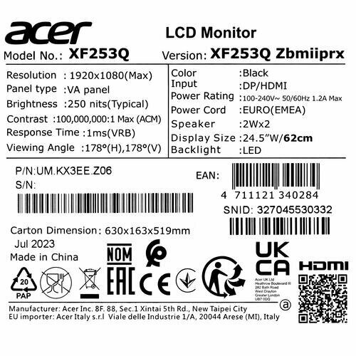 LCD Acer 24.5" Xf253qzbmiipr ips 1920x1080 240Hz 400cd 1ms DisplayPort Hdmi [um.kx3ee.z06]