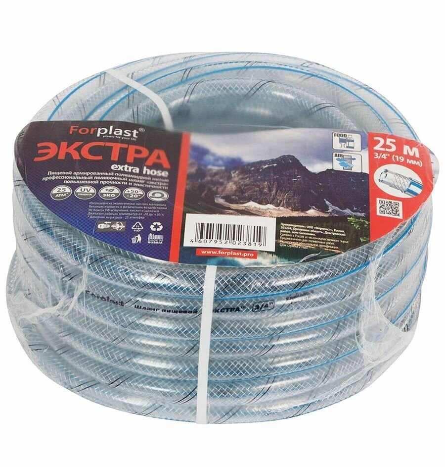 Шланг поливочный пищевой армированный Forplast Экстра PRO 3/4 (19 мм), 50 м, морозостойкий, прозрачный