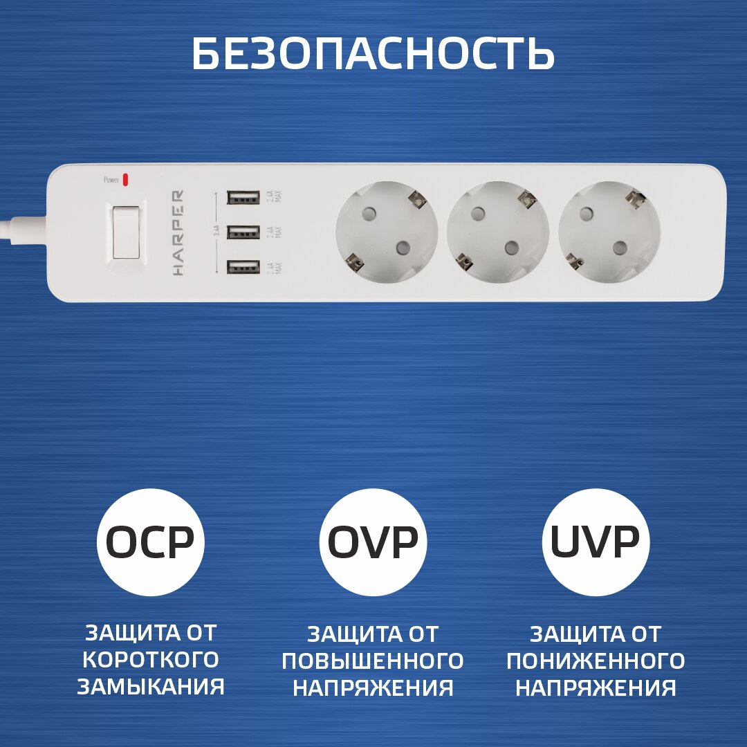 Сетевой фильтр HARPER UCH-315, 3 розетки, 1.5 м, белый