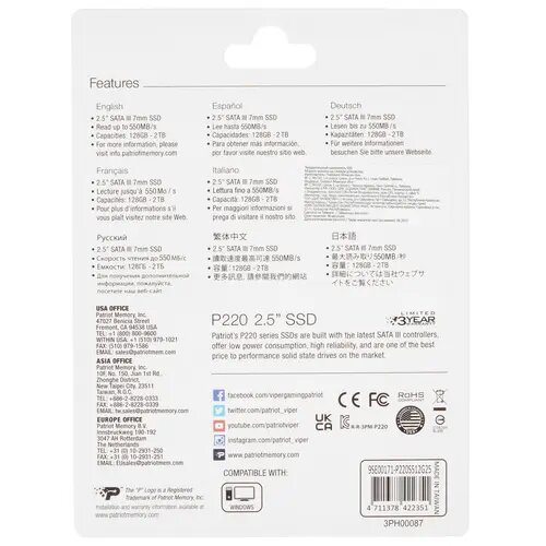 Накопитель PATRIOT SSD SATA III 512Gb P220S1TB25 P220 2.5" (P220S512G25)