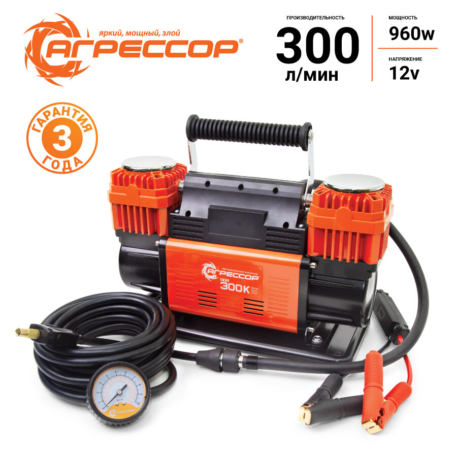 Компрессор автомобильный двухпоршневой АГРЕССОР, 300 л./мин, 900W, AGR-300K (насос автомобильный электрический)