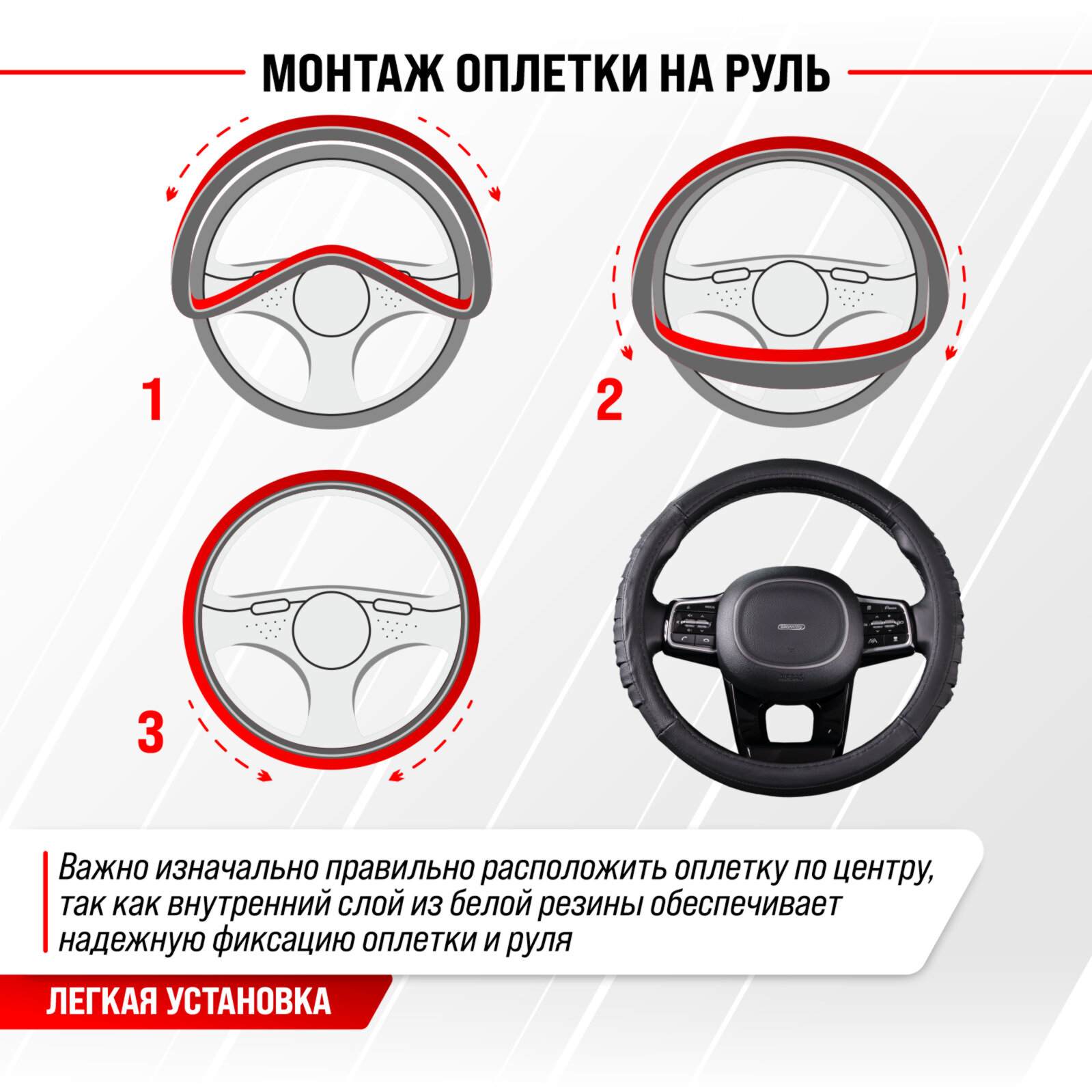 | Дополнительная информация | Рекомендации производителей: выбирайте оплётку под размер вашего рулевого колеса. Неверно выбранный размер может стать причиной проскальзывания оплётки или привести к невозможности снять или надеть её на руль. |