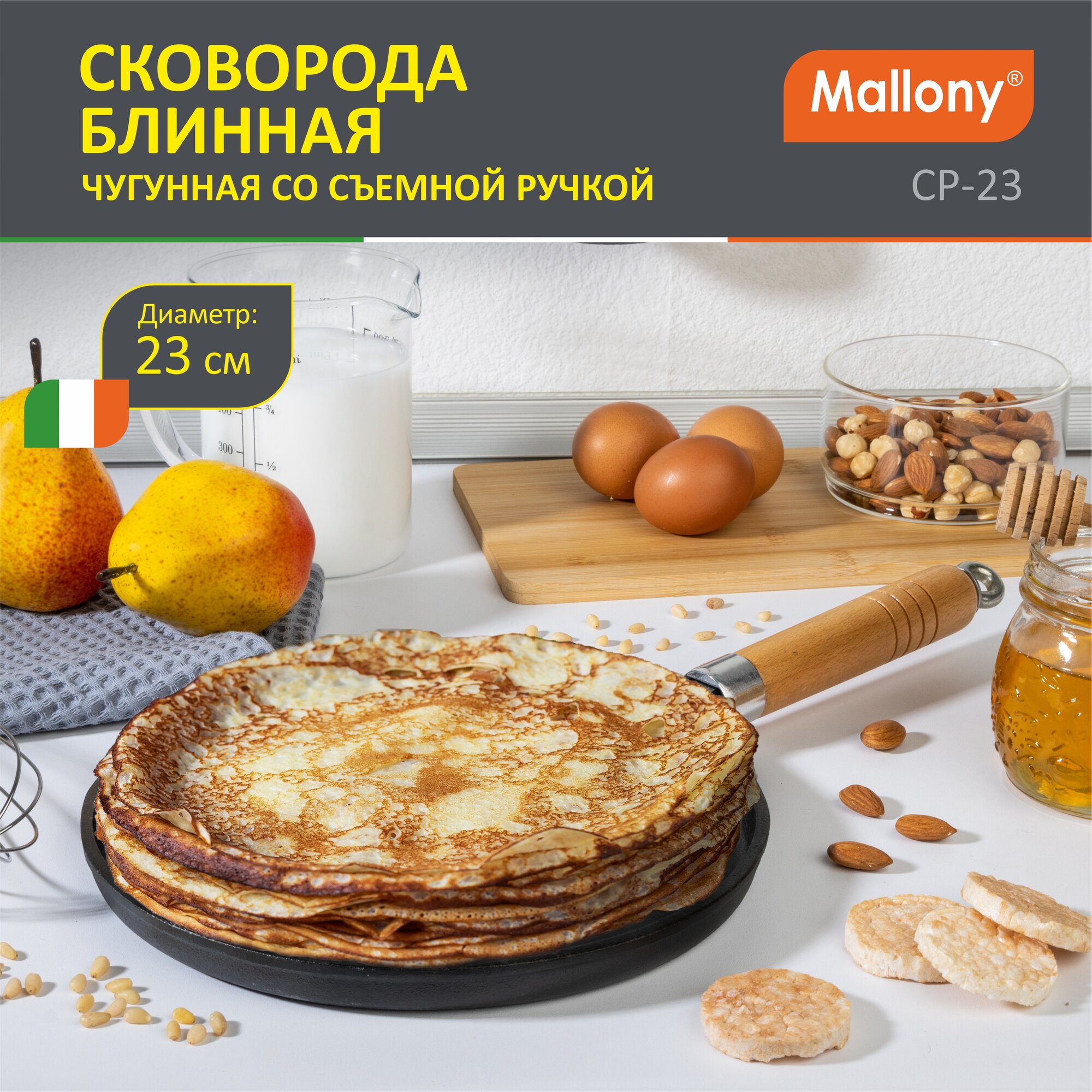 Mallony Сковорода блинная чугунная со съемной ручкой, 230 мм CP-23