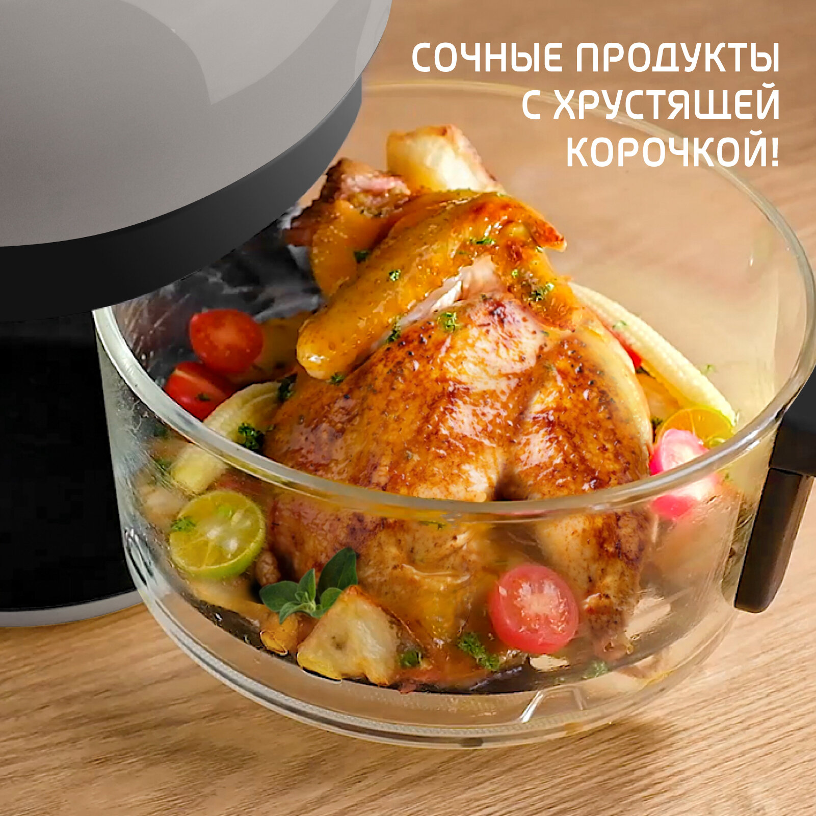 Очень долго выбирал аэрогриль. Хотелось со стеклянной чашей, но смущала щель между чашей и аппаратом. Оказалось зря беспокоился. Гриль выполняет все функции на отлично!! Верхняя часть не сильно греется. Больше 36.8 термометр не показал. Блюда получаются вкусные и сочные. Готовил куриный шницель, рыбу, котлеты, яблоки. Все очень вкусно. Корочка хрустит, а внутри сочно. Моется чаша легко. К ней ничего не пристает. Для семьи из 2 человек нормально. Но для большего количества человек маловата чаша. Рекомендую