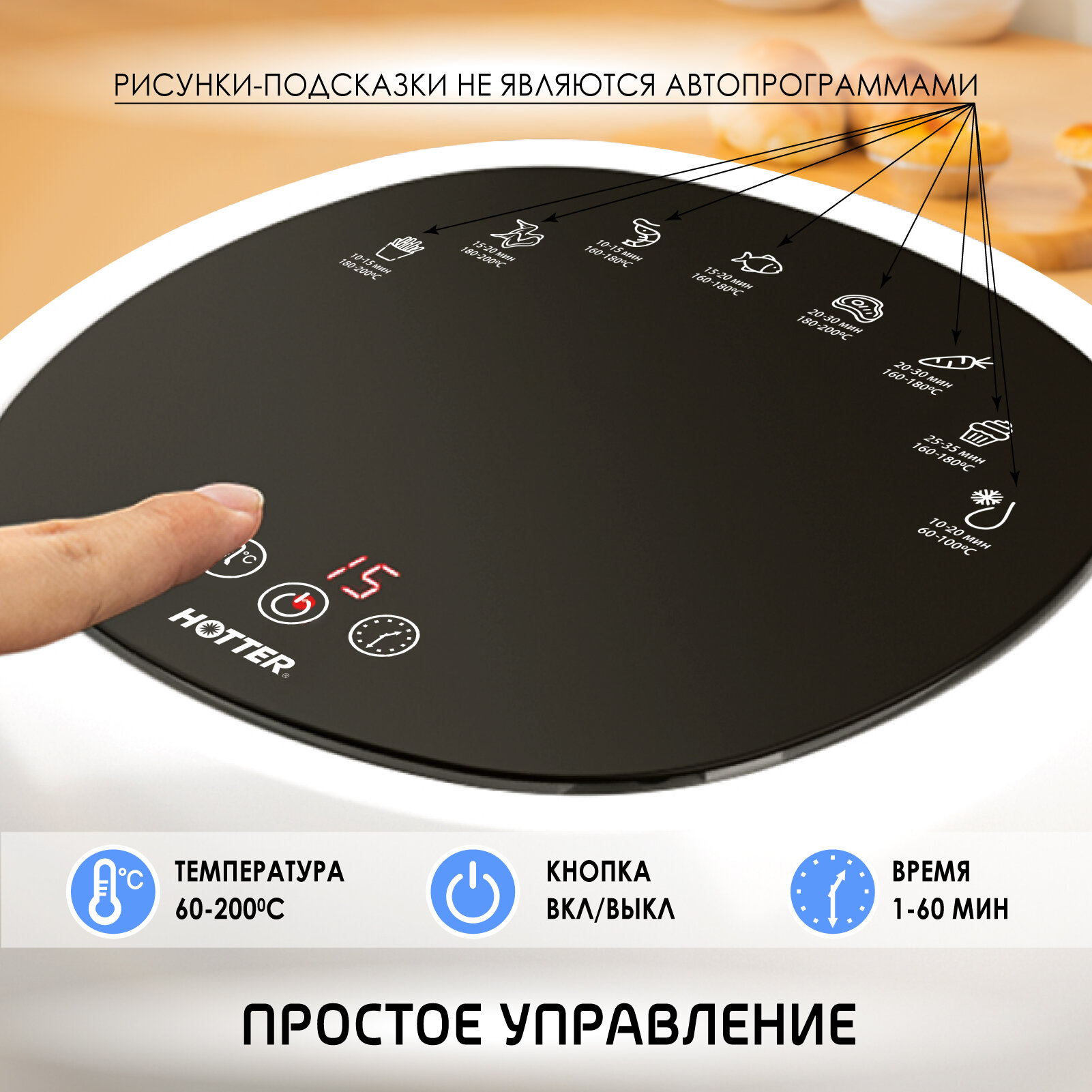 На панели расположены подсказки по настройке режимов, что исключает надобность постоянно доставать инструкцию! Красиво подсвечивает еду -придает шарм интерьера кухни ! Лааайк!