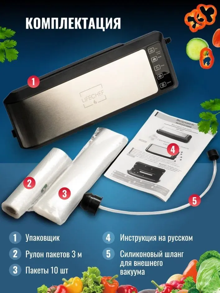 | Подробная комплектация | Упаковщик вакуумный - 1 шт; Руководство по эксплуатации - 1 шт; Силиконовый шланг - 1 шт; упаковочные пакеты - 10 шт; рулон упаковочных пакетов 3 метра - 1 шт |