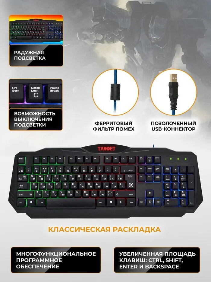 Игровой набор 4-в-1 Defender Target MKP-350 (клавиатура, мышь, коврик, гарнитура) интересное: